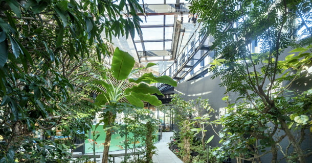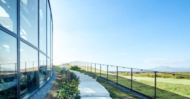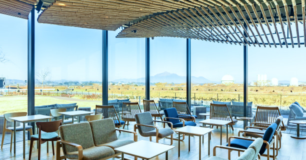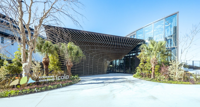 スターバックスとのコラボレーションプロジェクトから生まれた「KIRISHIMA GREENSHIP icoia」。ガラス張りの植物園「めぐりの森」では亜熱帯植物を楽しめるほか、屋上庭園「見晴らしの丘」、芝生エリア「いこいの庭」など、そのどれもが都城の風土と調和した"いこい"の場です。