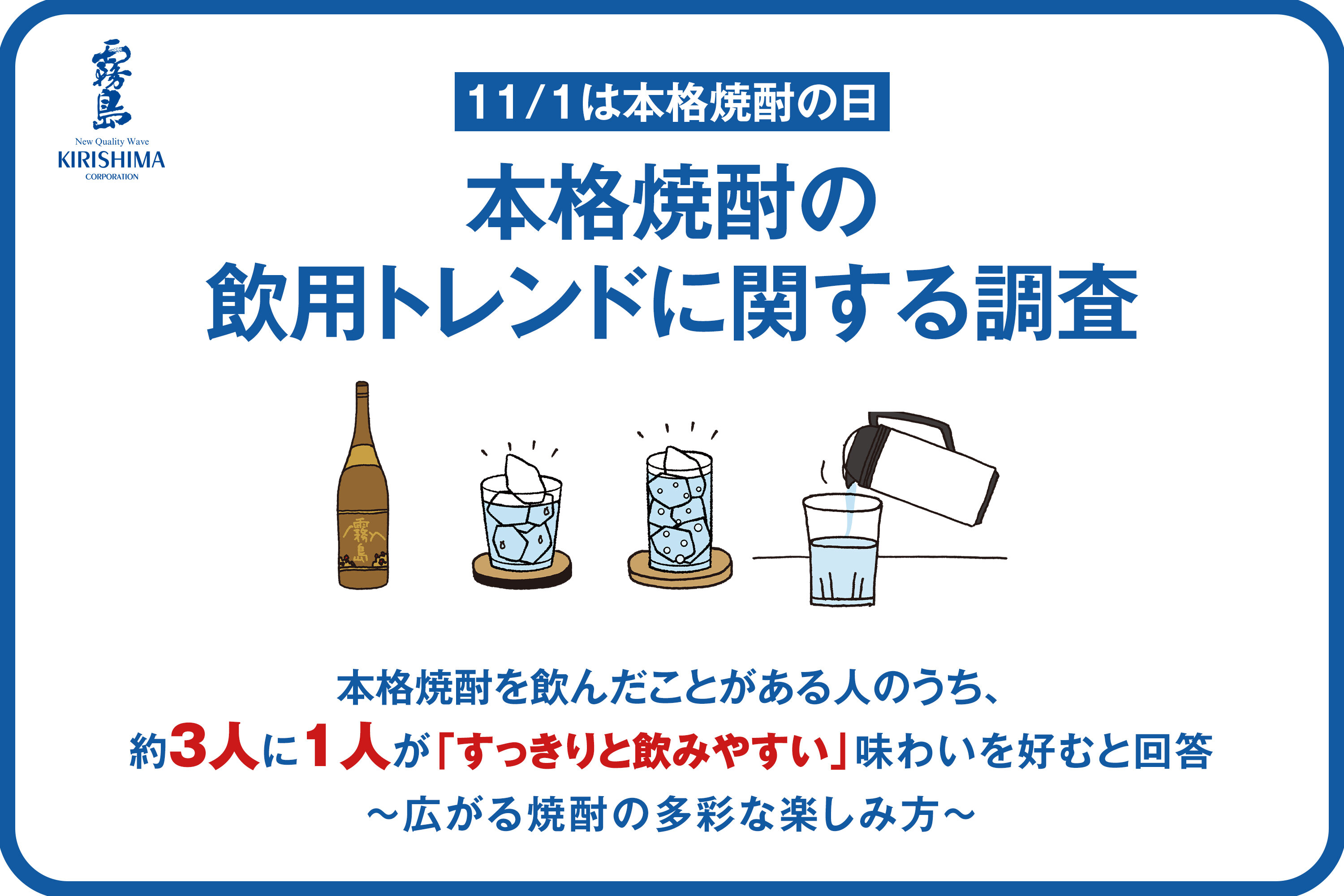 11月1日は「本格焼酎の日」。「本格焼酎の飲用トレンド調査」を実施。全世代が「すっきりと飲みやすい」味わいを最も重視。20代は「フルーティーな香り」への期待、 40代以下では食事に合わせて飲み方を変えるペアリング志向が判明。