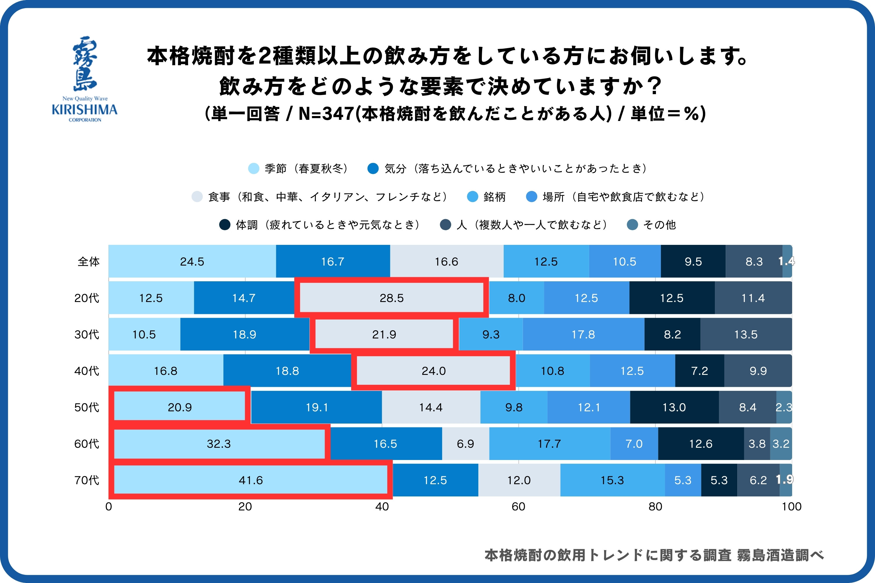 - 飲み方の使い分け――――20~40代では「食事」に合わせるペアリング志向、50~70代では「季節」に合わせて飲み方を使い分け。焼酎の多彩な飲み方がライフスタイルに調和