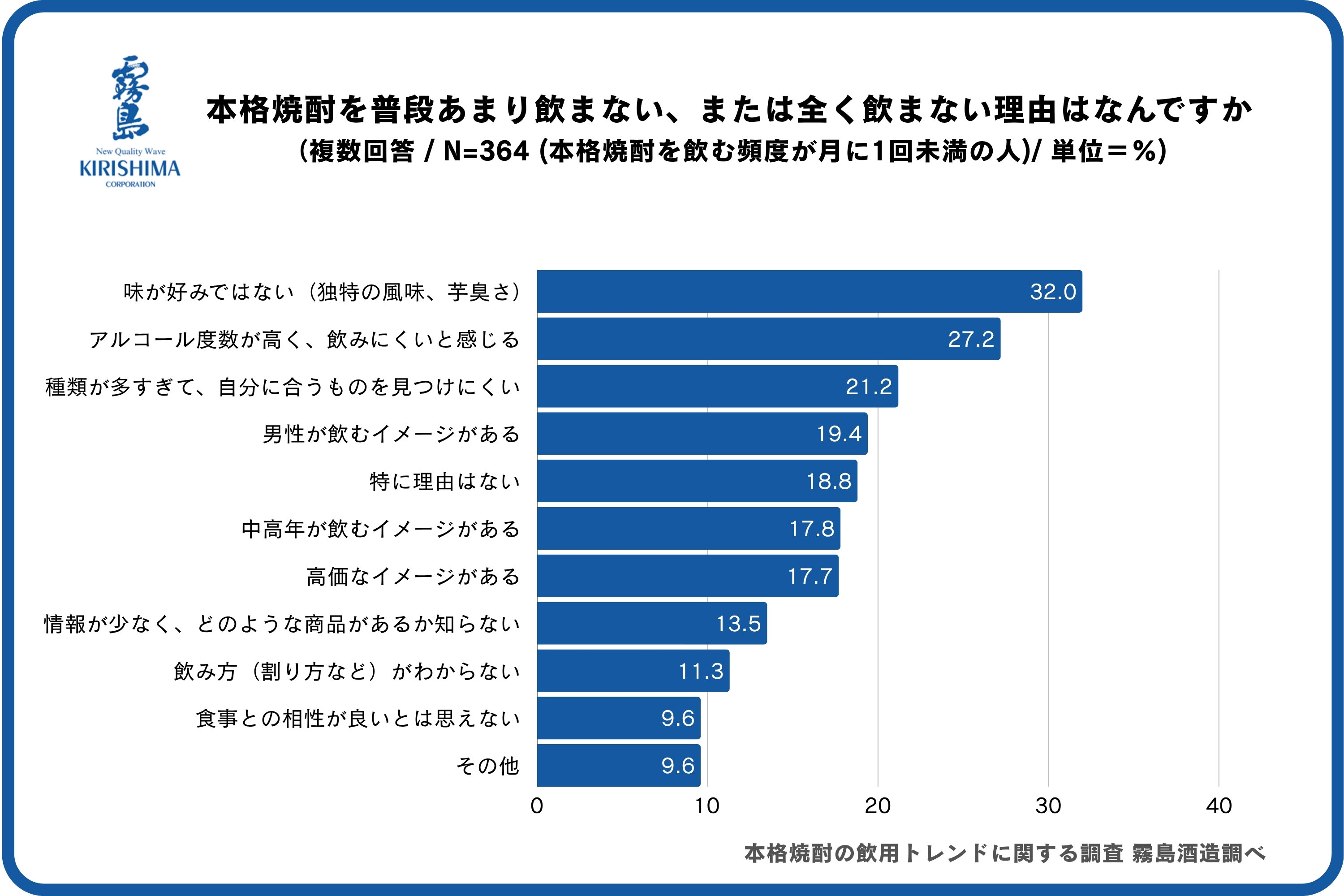 - 飲まない理由―――1位「味が好みではない」 、2位「アルコール度数が高い」、3位「種類が多すぎる」。本格焼酎の課題は過去の根強いイメージか