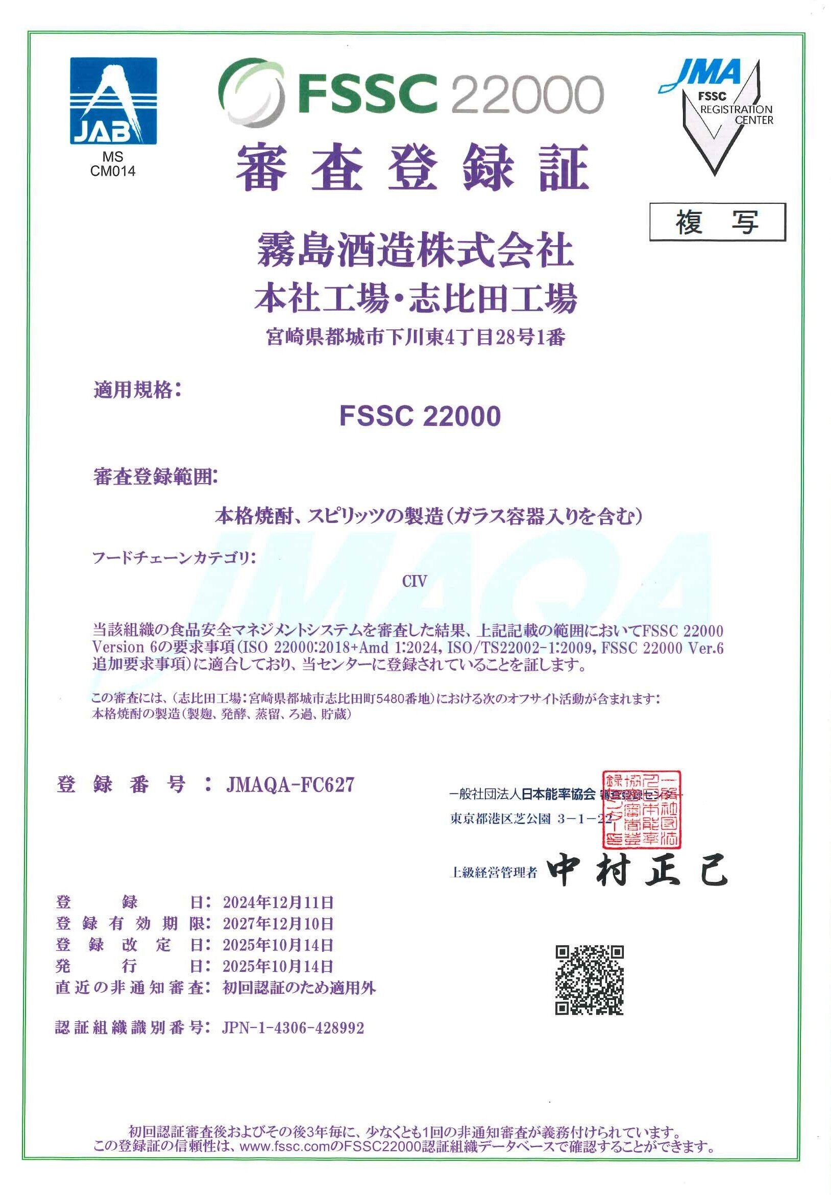| 認証取得拠点 | 霧島酒造株式会社 本社工場・志比田工場 |