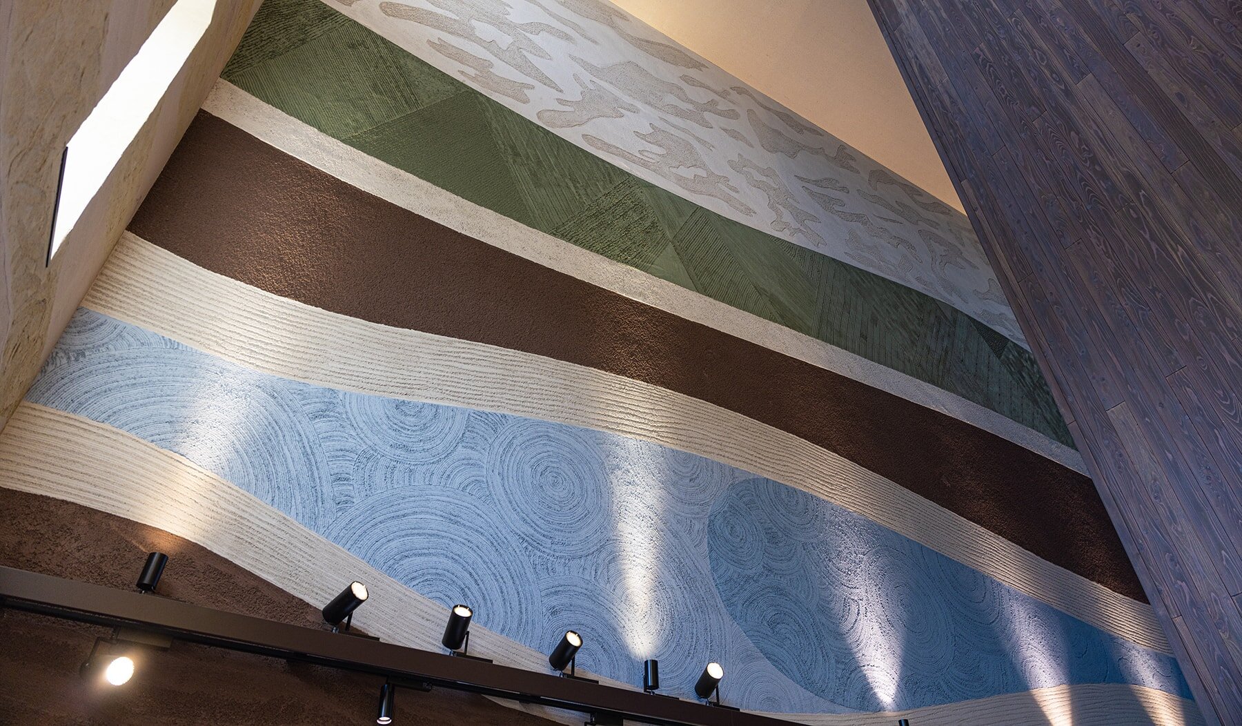 焼酎の工場見学施設『KIRISHIMA WALK FACTORY』のジオタワーでは、シラスを材料に使った左官アートを設け、見学にきたお客様を目でも楽しませている。