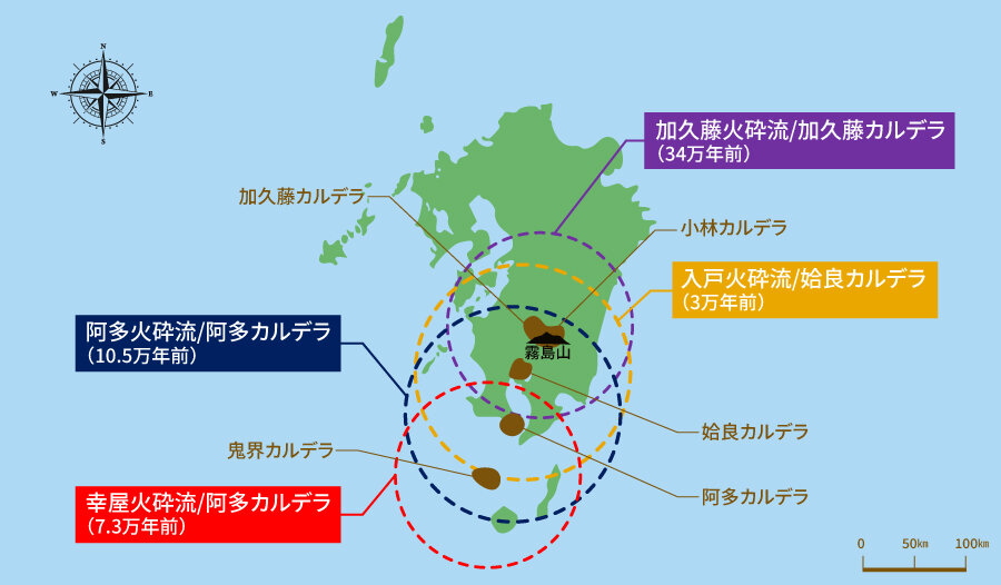 周辺には多くの火山が分布し、その山々が噴火するたびに火砕流や火山灰で南九州一体が埋め尽くされてきた。2万9千年前に起きた姶良大噴火は、その灰が関東まで届いたと言われている。こうして何万年も前から幾重にも積み重なった堆積物は、シラス台地としてこの土地特有の地質となった。