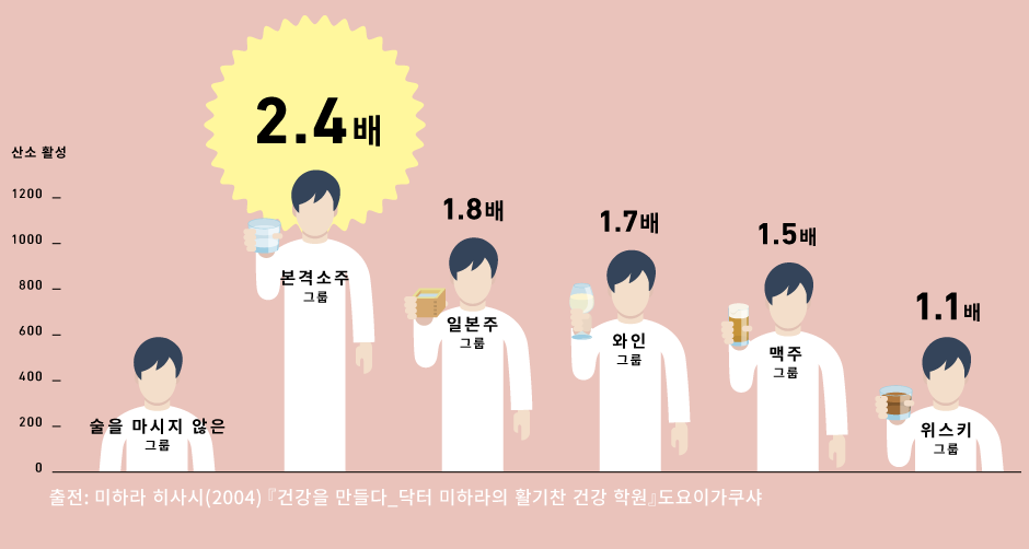 혈관이 막혀버리는 혈전증. 이것은 뇌경색을 시작으로 한 뇌혈관 질환이나 심장 질환을 일으킬 수 있습니다. 하지만 적당량의 소주에는 혈전 용해 효소를 활성화하는 효과가 있어, 혈액을 부드럽게 한다고 인정받고 있습니다.
