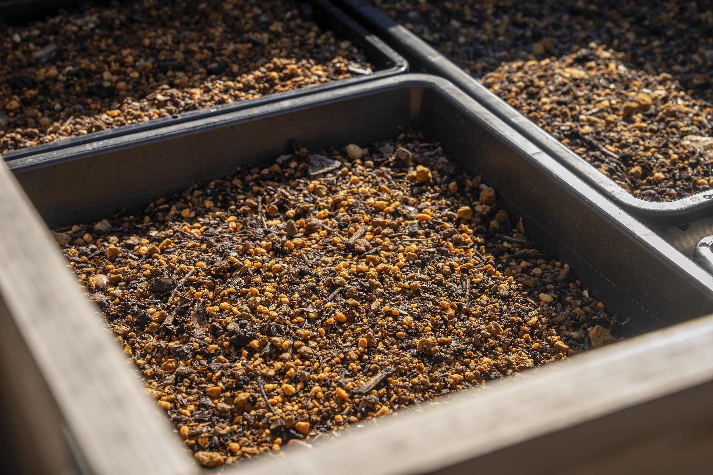 また、植物園「めぐりの森」では、焼酎を蒸留する際に発生する温熱を冬場の暖房として再利用することで、年間を通して亜熱帯植物をお楽しみいただけるほか、駐車場には実際にサツマイモ発電の電力が給電できるEV充電スタンドも完備。これらにより「KIRISHIMA GREENSHIP icoia」では、さつまいもやコーヒーから生まれるエネルギーを施設の“温度”や“電気”としてお客様に体感いただけます。さらに、両社の強みを生かした地域社会や自然環境に前向きなアクションとして、事業活動により排出される焼酎かすやコーヒーかすを用いた「たい肥づくり実験」を実施。完成したたい肥でどんぐりの苗木を育成し、将来的には植林するなど、これらの活動を地域の循環に繋げていきます。